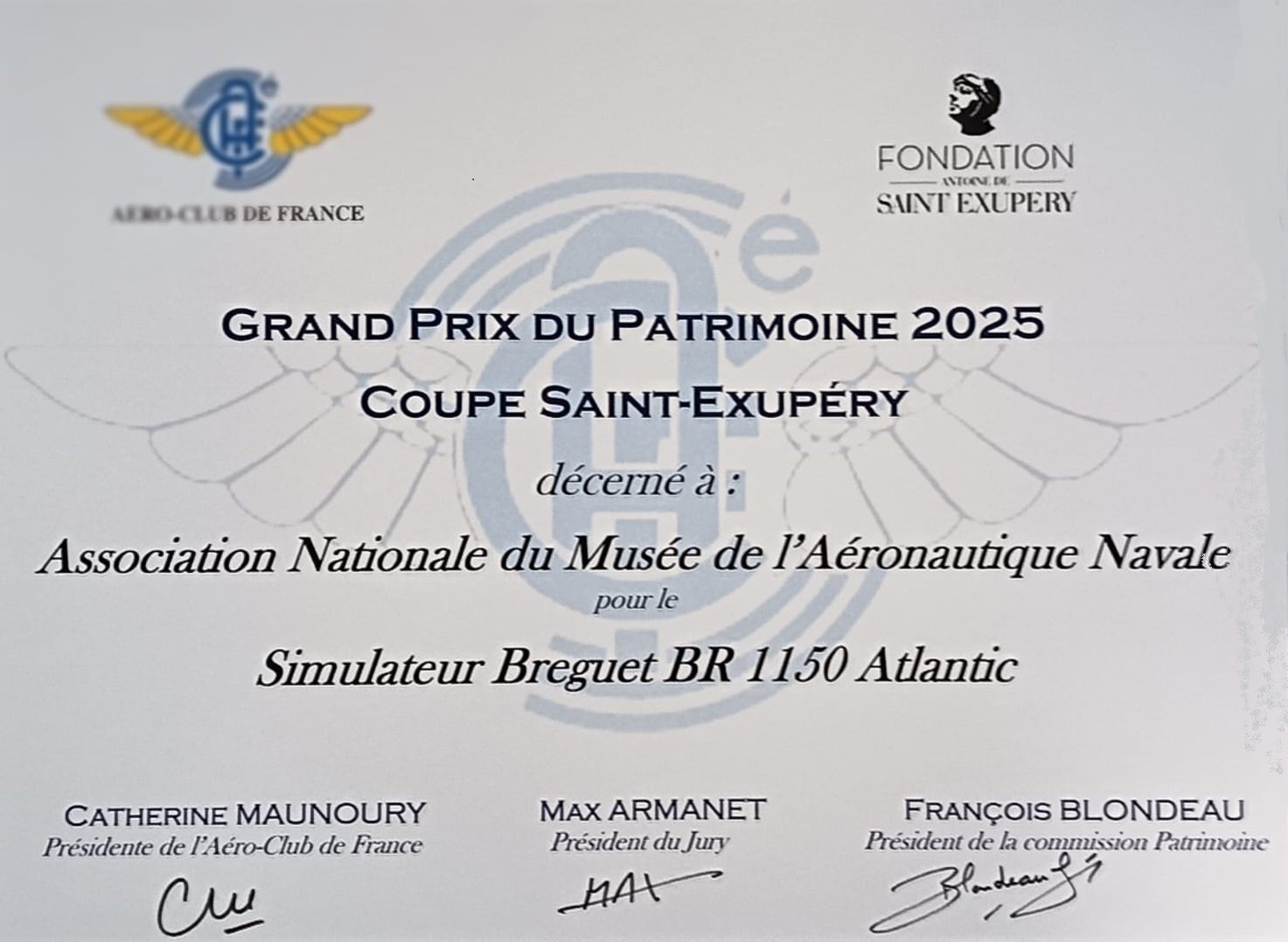 Tous nos remerciements s’adressent aux membres du Grand Prix du Patrimoine et son Président Max Armanet, à l’ Aéro-Club de France et sa Présidente Catherine Maunoury, ainsi qu’à Monsieur Olivier D’ Agay Délégué Général de la Fondation Antoine de Saint – Exupéry pour sa générosité qui va permettre de nouveau projet de protection de notre patrimoine.