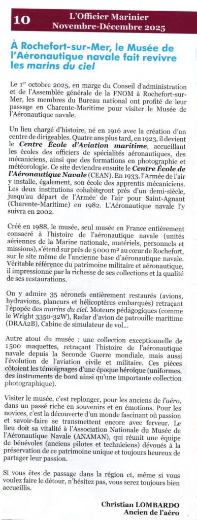 Pendant leur CA décentralisé à Rochefort les Membres de la FNOM (Fédération Nationale des Officiers Mariniers) s’ont venus visiter le Musée. Ils ont ensuite publié une double page centrale dans l’édition de novembre – décembre du périodique. Nous les remercions pour ce bel article.